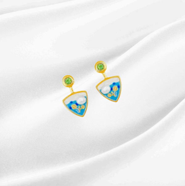 These handcrafted-style earrings showcase intricate enamel art with green, blue, and pearl accents. The triangular base and dangling format add movement and color, great for adding personality to ethnic or contemporary outfits. A perfect pick for art lovers and color enthusiasts.